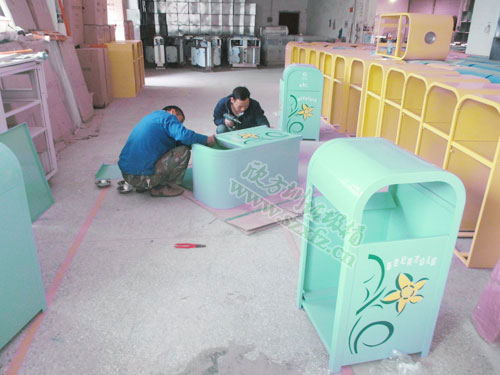 幼兒園的鍍鋅烤漆鋼制垃圾桶采用冷軋鋼材料,外框鍍鋅鋼厚度為2mm;內膽鍍鋅鐵皮厚0.5mm; 外桶L550*W550*540*H1030MM;新做滴鍍鋅烤漆垃圾桶,搖蓋式雙面投遞,上面絲印工藝的印花保持3到4年。還絲印有不可回收垃圾,英文 字母及環保標志等。五年以上的熟練老員工,經剪鈑下料、折彎、沖壓、焊接、打磨、等工藝:表面經過除油、噴砂防銹處理后,再進行酸洗磷化處理;表面清理干燥后整體進行靜電噴涂或烤漆處理,靜電噴涂是經過流水線高溫固化爐固化后再出爐冷卻,加工后的塑粉附著力強,不易剝落。