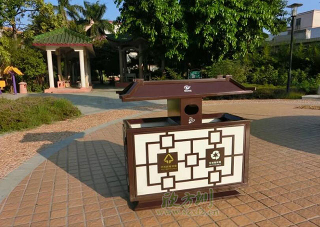 最近剛接到廣西桂林市的市容園林局來電,詢問適合放在街道兩邊的垃圾桶,相關負責人稱,為了提升一二類道路的形象,要求款式特別一點,經我們的推薦,客戶再三挑選,最終選中了我們欣方圳垃圾桶廠家精心設計定做的這款中國風分類垃圾桶,就是以下這款款式新穎典雅的復古中國風垃圾桶,鋼制垃圾桶雖是藏污納垢之處,但也體現了一個城市的形象,這樣有設計感的戶外垃圾桶確實很有特色。更環保安全呢!