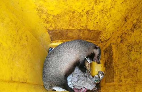 現(xiàn)場(chǎng)據(jù)周某稱,她一早來(lái)收垃圾桶,突然發(fā)現(xiàn)該垃圾桶內(nèi)竟有一只兇猛怪異的動(dòng)物,見(jiàn)來(lái)人靠近,立即瞪眼張嘴,做出要咬人的樣子,因該垃圾桶靠近山體,桶內(nèi)很深,懷疑是該動(dòng)物從山上掉落后無(wú)法爬出。現(xiàn)場(chǎng)查看,該動(dòng)物肚大腰圓,貌似已懷孕。現(xiàn)場(chǎng)有小區(qū)居民稱,小區(qū)緊鄰獅子山,一邊更有護(hù)城河,環(huán)境極佳,經(jīng)常見(jiàn)到不少小型的野生動(dòng)物出沒(méi),但該動(dòng)物外貌奇特,他們從未見(jiàn)過(guò),不知到底啥物。初步判斷,應(yīng)是在山上找食時(shí),不慎掉落桶內(nèi)。